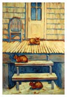 In this painting Mary used a palette of colors that that would express the hard times of this era. This was a time when people knew their neighbors and helped each other. She saw three men in front of a store not knowing the future; their social standing didn't seem to matter now. You can only imagine what they did, why they were there and what they might be thinking.